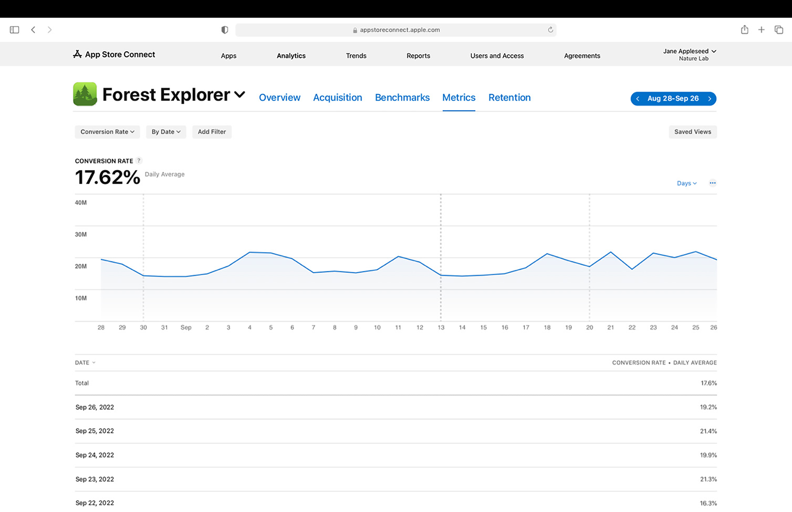 Review your search performance on an ongoing basis to understand the impact of your metadata. Use App Analytics in App Store Connect to monitor key metrics such as impressions, conversion rate, downloads, and more. You can filter by source type for more detail — for example, filtering conversion rate to understand how many people downloaded your app from App Store search. Keep in mind that your Apple Ads performance shows up here as well.