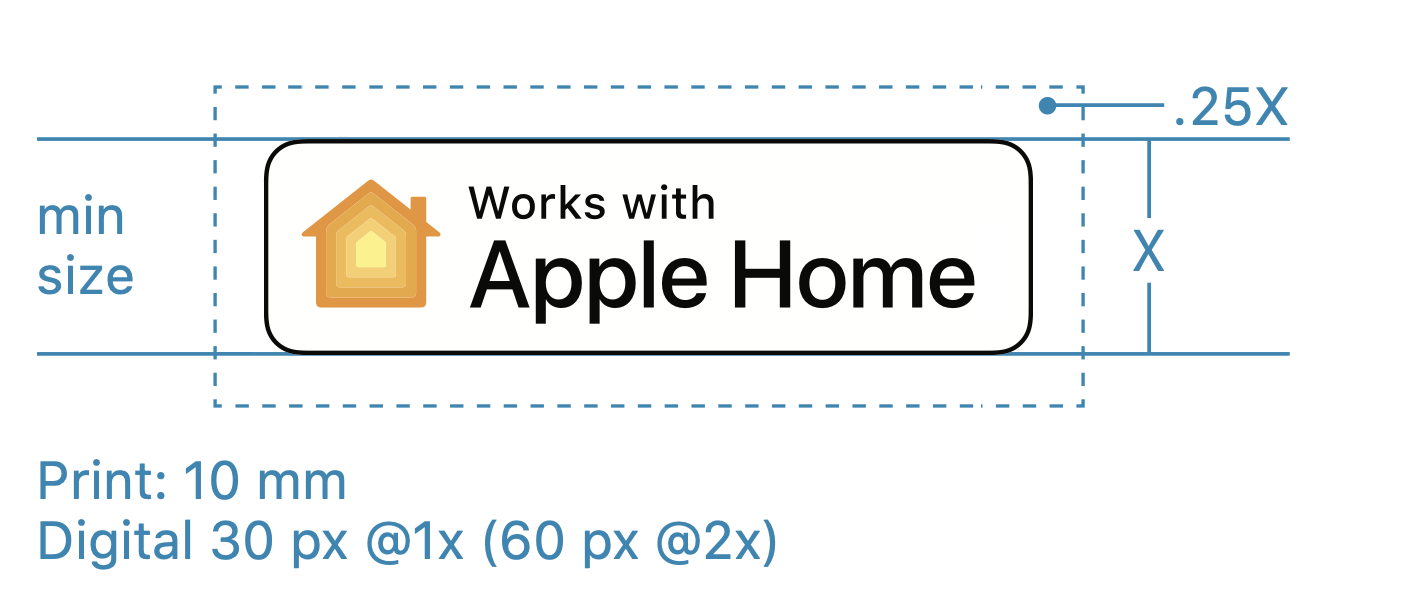 The minimum height for a Works with Apple Home badge is 10 mm on printed communications and 30 pixels for onscreen use. The minimum clear space around the badge is equal to one-quarter the height of the badge. Don’t place graphics, type, photographs, or illustrations inside the clear space area.