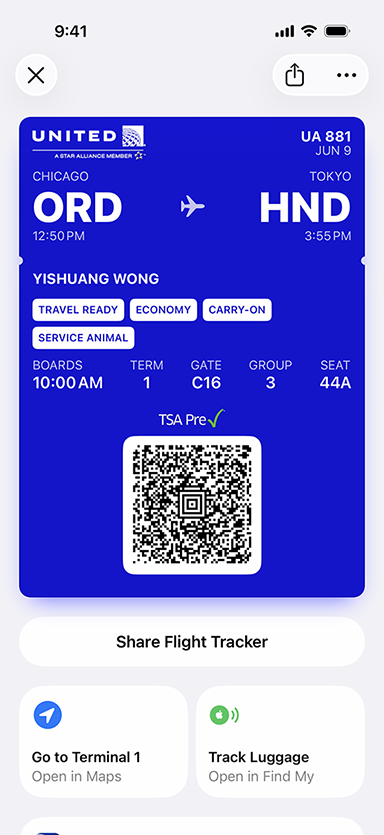 用户可以在 iPhone、iPod touch 或 Apple Watch 上的钱包中使用凭证。凭证可以在适当的时间显示在锁定屏幕上,例如当用户到达机场或走进商店时。