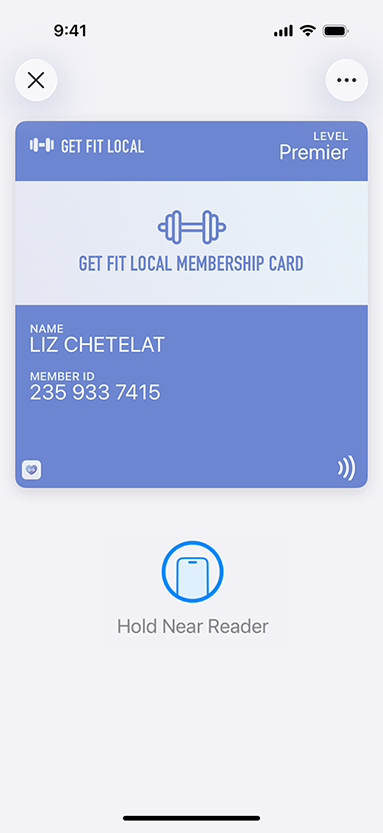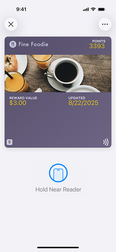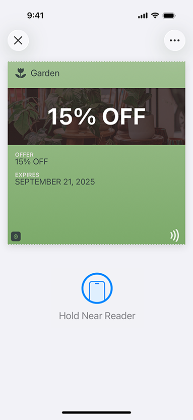 凭证可与 NFC 读取器配合使用,以实现免接触式兑换。用户将他们的设备靠近带有免接触式符号的读取器即可使用凭证,无需出示条形码。如果你要开发支持 NFC 的凭证以搭配 Apple Pay 使用,进一步了解如何在 Apple 平台上支持会员卡及相关凭证。