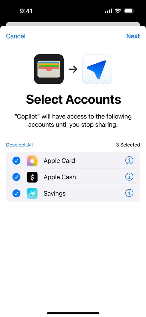 When your financial management app integrates with FinanceKit, the app provides full transparency into the information it requests and how the requested information will be used. Users have control over information about specific accounts that they'll share with your app, as well as the time range of the information shared. This information is retrieved directly from the on-device data store and never seen by Apple.