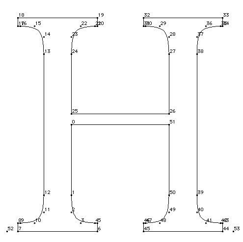 The grid-fitting instructions for the H necessarily refer to the outline points that make up the glyph description. Figure 11 shows the upper case H outline along with the on-curve and off-curve points that define that outline. The instructions for this glyph follow. Each instruction is accompanied by an explanation of the work it does and, if relevant, an illustration of the points it affects or uses.The instructions begin with the x-direction, the default direction for the freedom and projection vectors.The work of instructing the glyph proceeds from left to right. Instructions80% in the y-direction follow.