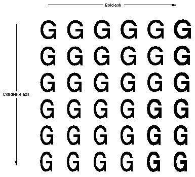 Style coordinates can be combined to allow style variations with two, three, four, or any number of style axes. For instance, you may choose to create a font with a bold and condense axes. The user of the font can then specify any simultaneous combination of boldness and condenseness. An example of a two-dimensional array of capital "G" glyphs for a font with style variations for bold and condense is shown in the next figure. The condense style increases from top to bottom and the bold style increases from left to right. Any of the glyph styles shown or any glyph styles between those shown can be selected by specifying the desired coordinates on the two style axes. The default glyph is shown in gray.