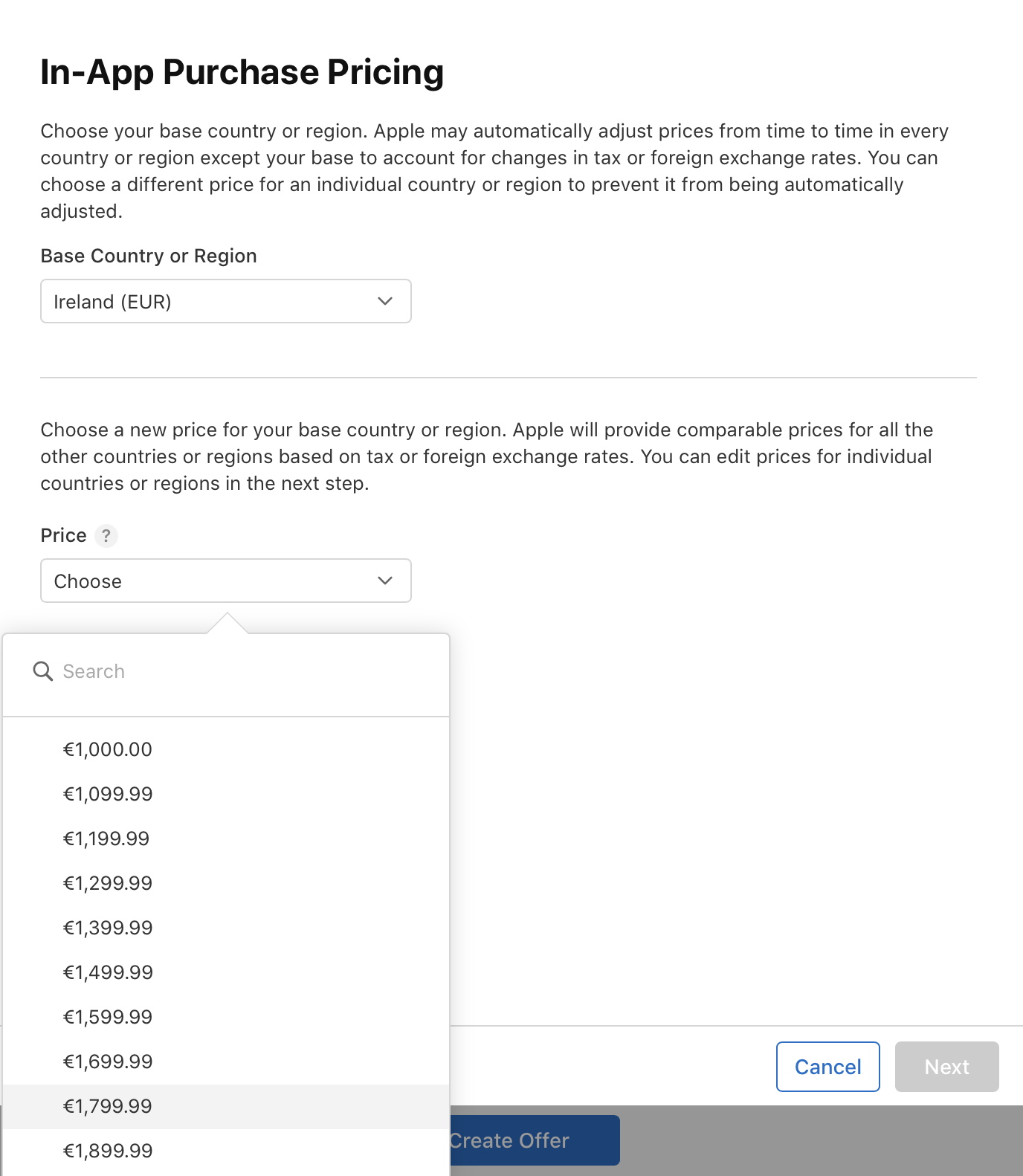 Firstly, we have encountered a limitation in App Store Connect where the maximum price tier available for non-renewing subscriptions in Euros is €1199. However, our product is priced at €1799. Could anyone please advise how we can handle this scenario? Is there a way to request custom pricing beyond the available tiers, or is there an alternative approach you would recommend?