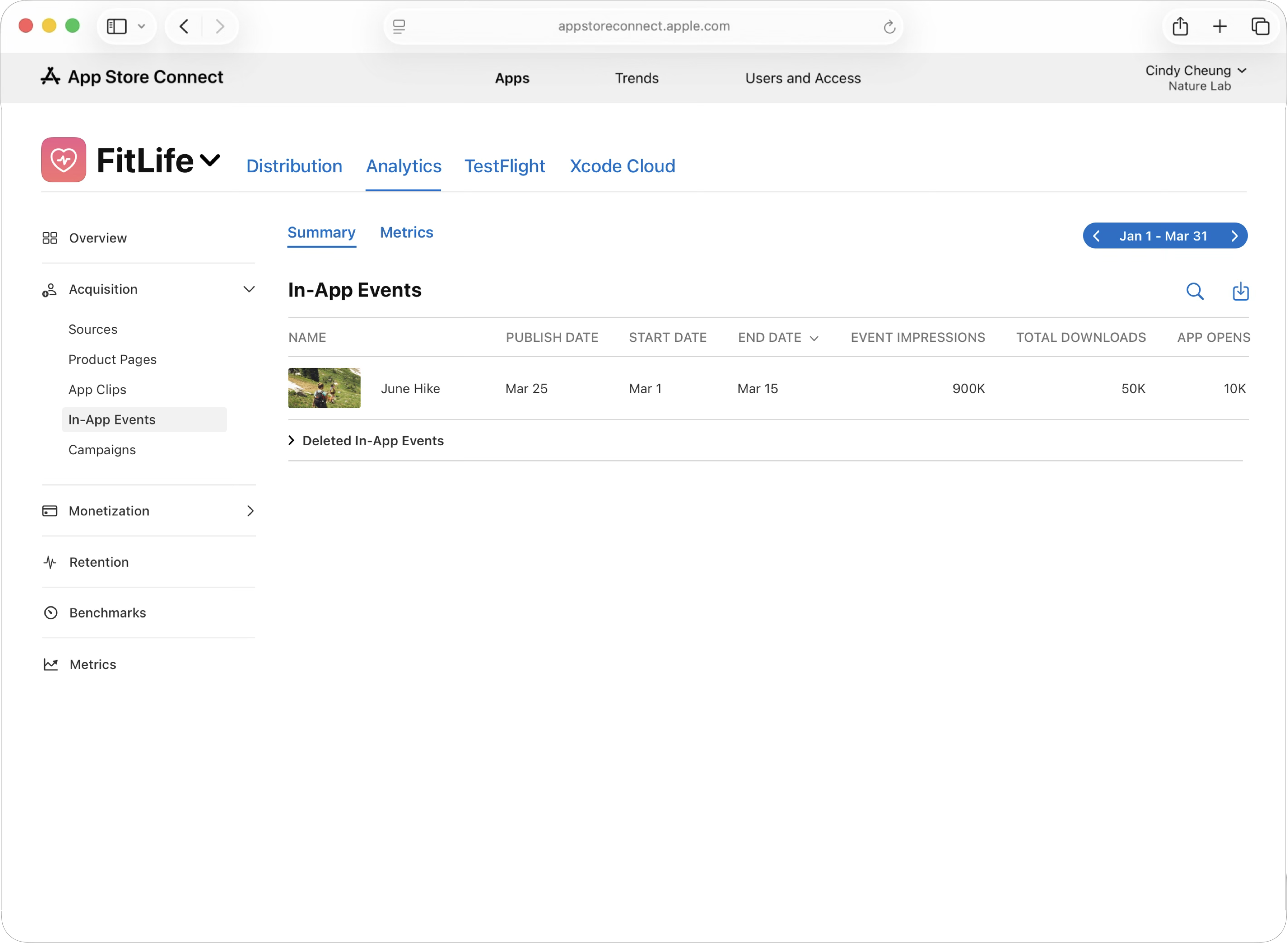 The metrics below are provided to help you analyze your In-App Event activity on the App Store. You can also filter Download, Usage, and Sales metrics by specific In-App Events to learn what happens after a user downloads or redownloads your app from an In-App Event card on the App Store.