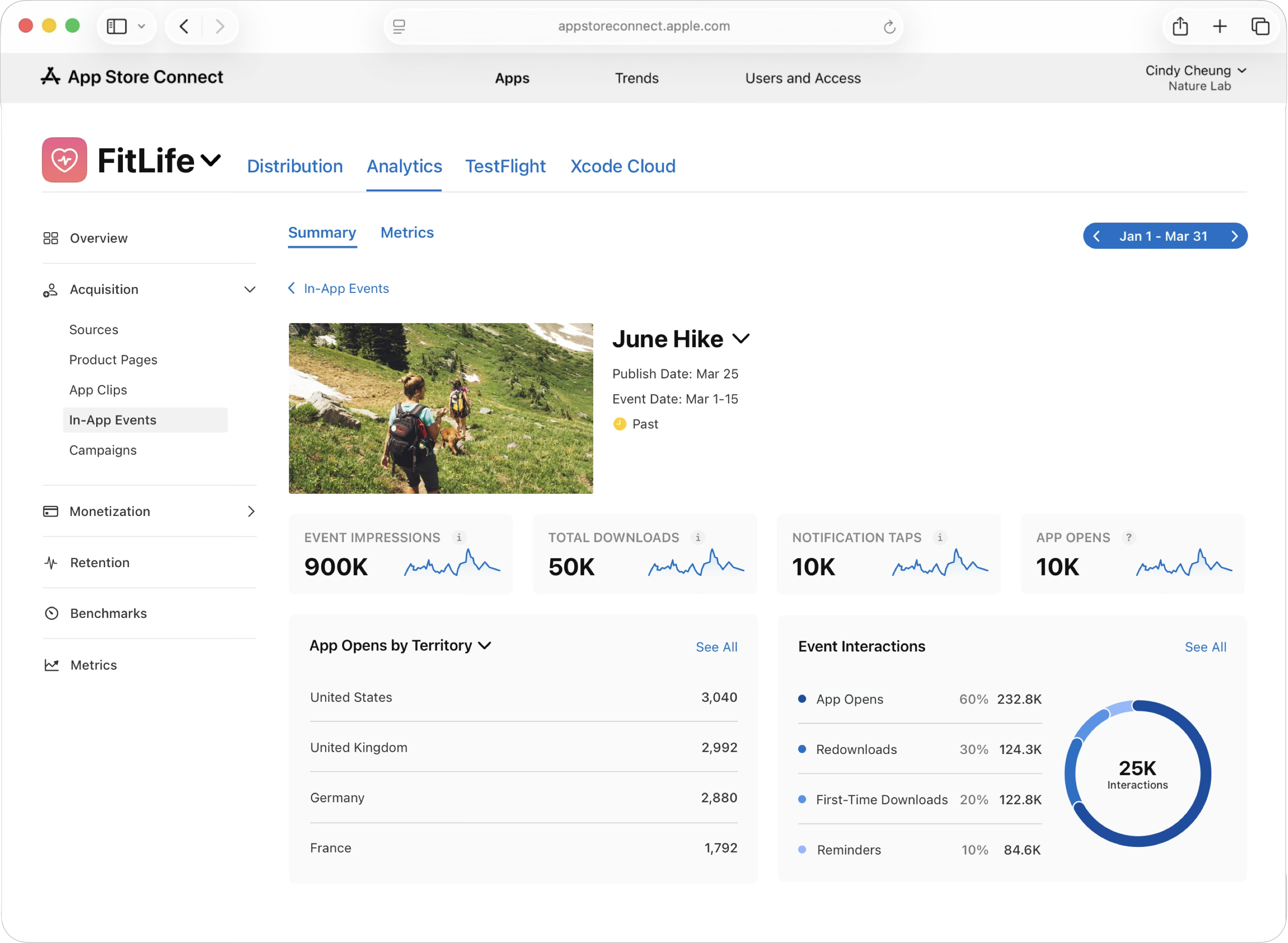 Acquisition: Measure Downloads and Redownloads that were directly driven by your event. You can filter all of these metrics by dimensions like territory, source type, and device to understand which events and promotion strategies are most effective.