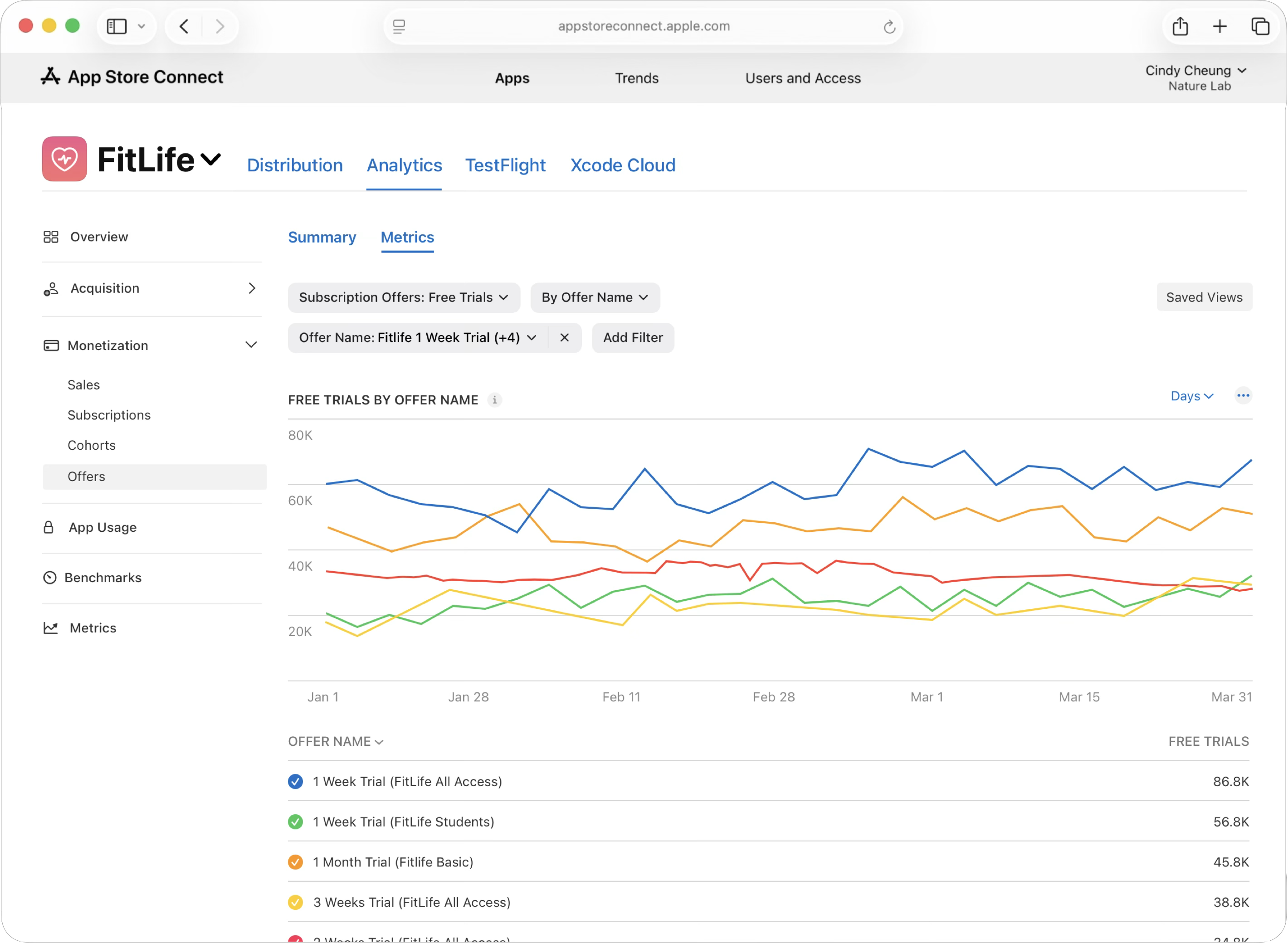 Offers enable you to grow, retain, and re-acquire customers by giving them a free or discounted price on your In-App Purchases. Use app Analytics to track the performance of your subscription offers (including introductory, offer codes, promotional, and win-back offers) to understand how effectively these discounts are helping to grow, retain, and re-acquire customers.