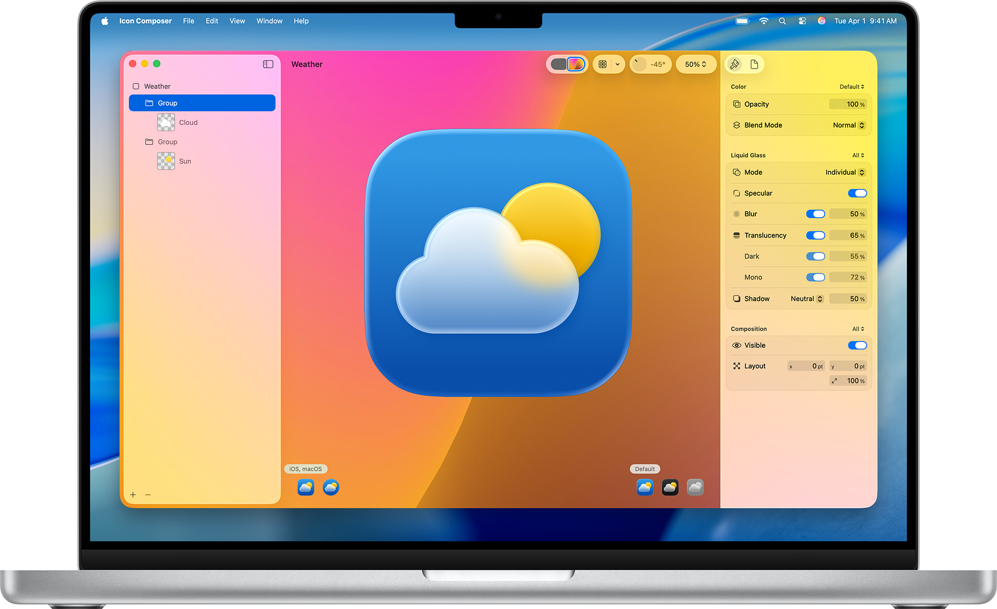 Icon Composer lets you create layered icons out of Liquid Glass from a single design for iPhone, iPad, Mac, and Apple Watch. With a new multi-layer icon format, you can easily adjust Liquid Glass properties, preview with dynamic lighting effects, and annotate across appearance modes. Icon Composer is designed to work seamlessly with Xcode, and also provides the option to export a flattened version of your icon for marketing and communication needs.