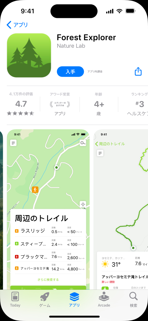アプリのUIをキャプチャした画像で、アプリのユーザー体験を視覚的に伝えることができます。App StoreとMac App Storeのプロダクトページでは、スクリーンショットを最大10枚まで掲載できます。アプリプレビューがない場合、検索結果にはスクリーンショットの最初の1〜3枚(画像の向きによって異なる)が表示されます。そのため、最初の1〜3枚にはアプリの重要なポイントが表現されている画像を選ぶことが大切です。3枚目以降は、アプリの主な利点や特徴にフォーカスし、アプリの価値をアピールします。アプリをダークモードに対応させる場合は、ユーザーがアプリの見た目を確認できるスクリーンショットを少なくとも1枚含めることを検討してください。