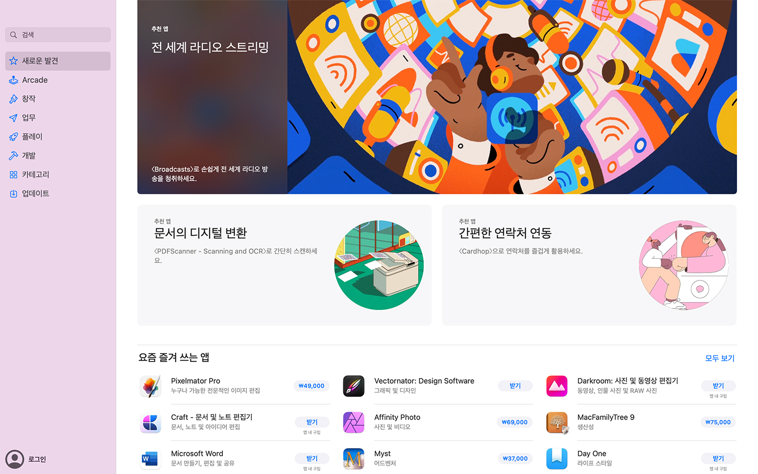 Mac App Store에서 발견은 가장 주목받는 신규 앱 및 업데이트된 앱을 찾을 수 있는 곳입니다. 에디터는 매주 심도 있는 소개와 비하인드 스토리 인터뷰, 엄선된 컬렉션을 통해 놀라운 앱과 게임을 조명하여 보다 풍부한 Mac 경험을 제공합니다.