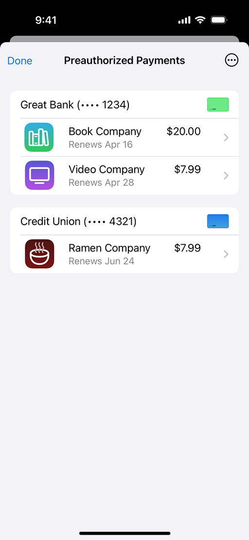 지갑 앱의 완전히 새로워진 ‘사전 승인된 결제’ 섹션에서는 Apple Pay를 통해 승인된 반복 청구 내역을 더 명확하게 확인할 수 있습니다.1 이제 사용자는 구독, 자동 충전, 할부 대출 상환, 반복 청구, 예약 결제를 보다 효과적으로 추적하여 지속적인 재무 활동을 더 정확하게 파악할 수 있습니다. 또한 ‘사전 승인된 결제’를 통해 사용자는 가맹점 또는 발급사에 대한 반복 청구 내역을 보다 효과적으로 관리할 수 있으며, 필요한 경우 지갑에서 결제 승인을 취소할 수 있습니다.