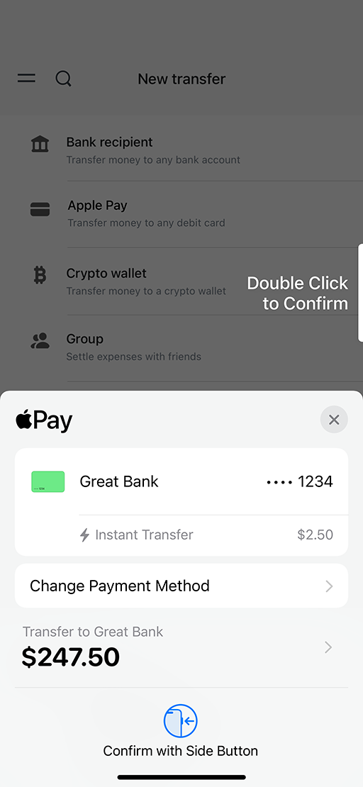 고객이 계좌에서 지갑 내 카드로 송금할 수 있도록 지원해 보세요. 사용자는 결제 시트에서 바로 송금처를 선택하기만 하면 카드 세부 정보를 수동으로 입력할 필요가 없으며, 가맹점의 송금 수수료도 간결하게 확인할 수 있습니다.