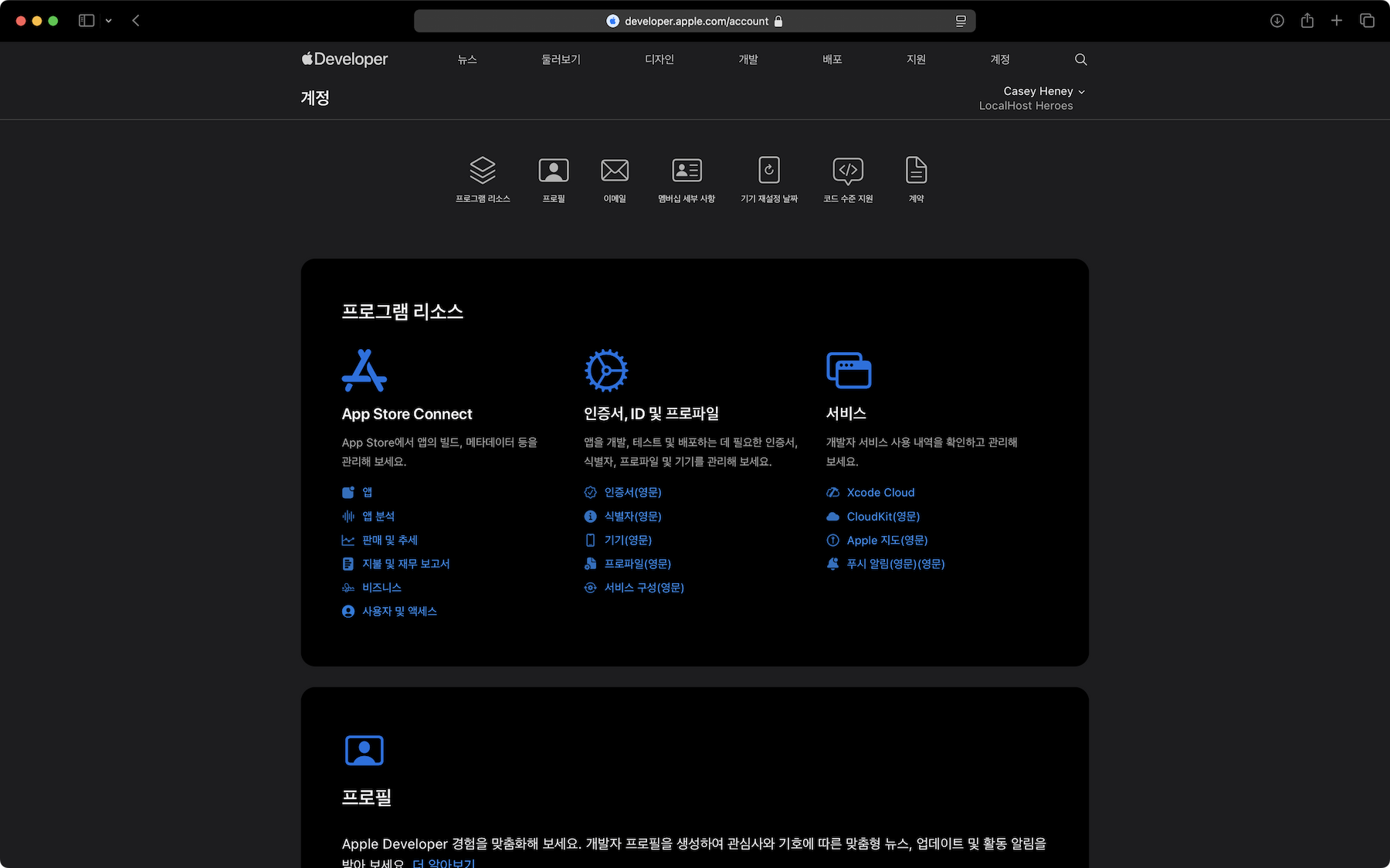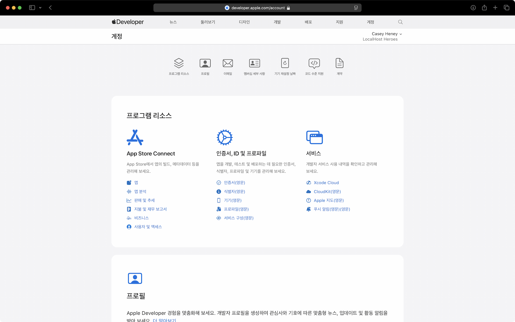 Apple Developer 웹사이트의 어느 페이지에서든 오른쪽 상단에 있는 계정을 클릭합니다.