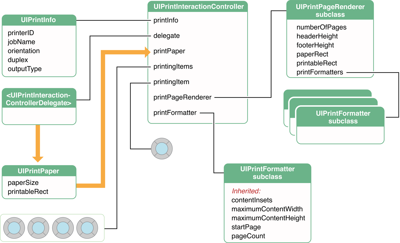 The UIKit printing API includes eight classes and one formal protocol. Objects of these classes and the delegate implementing the protocol have runtime relationships as depicted in Figure 5-7.