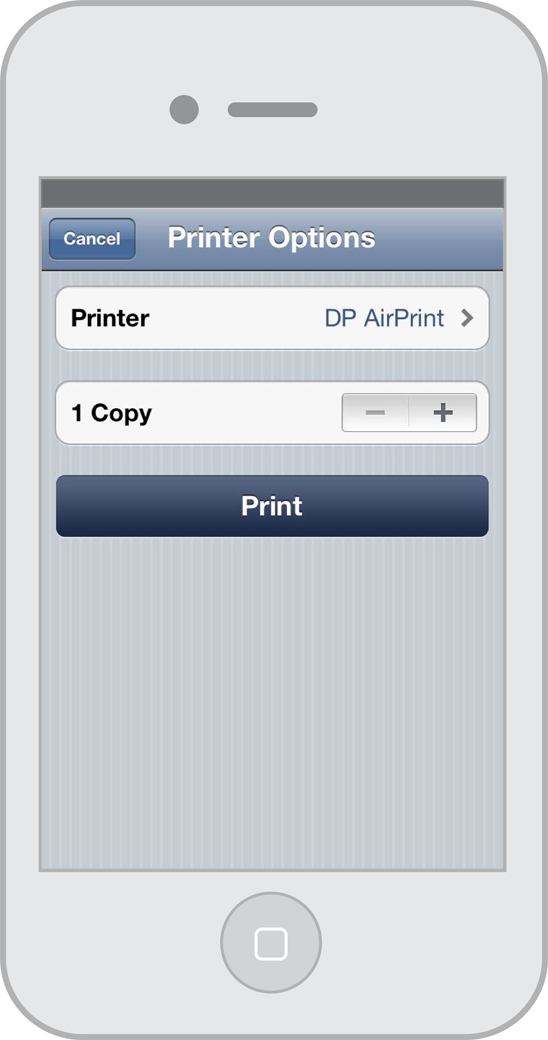 When a user taps the print button, a controller object of the app receives the action message. The controller responds by preparing for printing and displaying the printer-options view. The options always include the destination printer (selected from a list of discoverable printers), the number of copies, and sometimes the range of pages to print. If the selected printer is capable of duplex printing, users can choose single-sided or double-sided output. If users decide not to print, they tap outside the options view (on iPad) or tap the Cancel button (on iPhone and iPod touch) to dismiss the printer-options view.