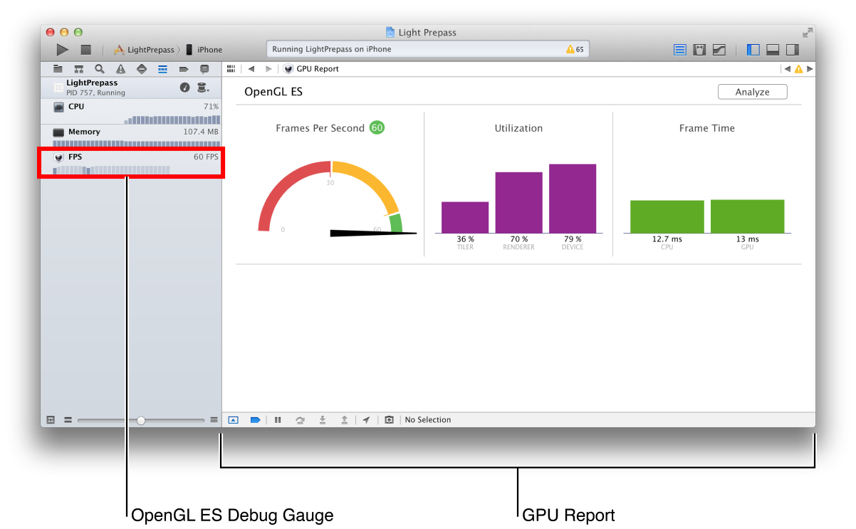 The FPS debug gauge and accompanying GPU report, shown in Figure B-1, provide a high-level summary of your app’s OpenGL ES performance while it runs. By monitoring these displays when developing your app, you can discover performance issues as they arise and consider where to focus your tuning efforts.