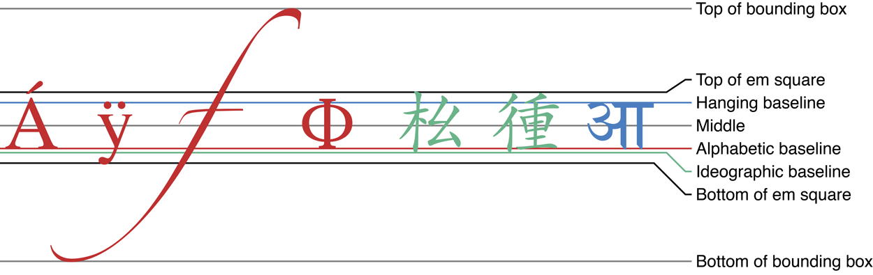 The default text baseline is the alphabetic baseline—the bottom of most letters in the roman alphabet (the descender of a lowercase y, p, or q drops below it).