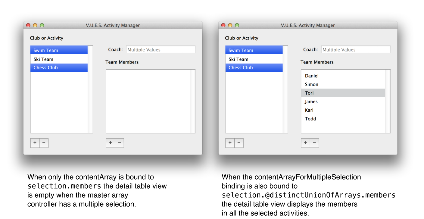 However, what happens if the master table view is configured to allow multiple selection? If only the detail array controller’s contentArray is bound, the detail table view is empty. While this is logical, it isn’t necessarily the desired results. A better option might be to display a unique list of the members in the selected activities. This is where the contentArrayForMultipleSelection binding and the key-value coding collection operators come into play.