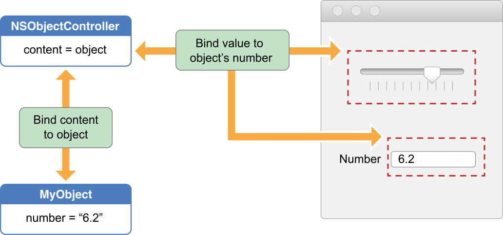 Note that this implementation does not use the target-action pattern. The slider does not send an action message to the controller. Instead, as the slider moves, it informs the controller directly that the value of its content’s number has changed and what the value is. The controller updates the model and in turn informs the text field and slider that the value they are displaying has changed. (In examples as simple as this controllers are not really necessary, however in most cases they are.) The mechanisms used to relay information are explained later in this article and in greater detail in How Do Bindings Work?, but it is important to appreciate that in most cases you will not have to write any glue code.