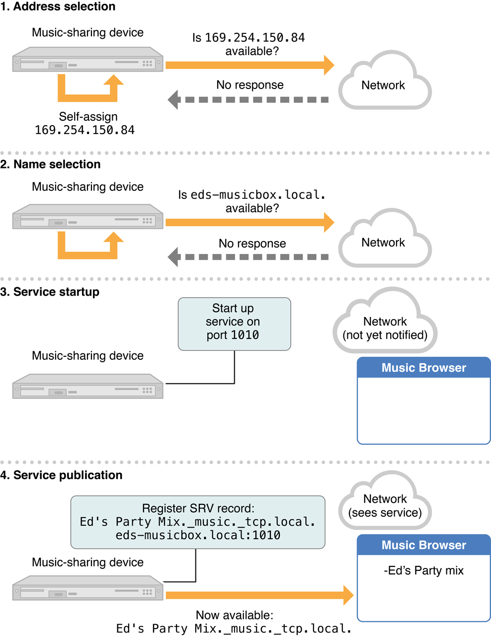 In step 1, the device randomly selects the link-local IP address 169.254.150.84, randomly selected from the IPv4 link-local range 169.254.0.0 with a subnet mask of 255.255.0.0, and announces it to the network. Because no devices respond to the announcement, the device takes the address as its own. In step 2, it starts up its own Multicast DNS responder, requests the host name eds-musicbox.local., verifies its availability, and takes the name as its own. Next, in step 3, the device starts up a music sharing service on TCP port 1010. Finally, in step 4, it publishes the service, of type _music._tcp, under the name Ed’s Party Mix, in the local. domain, first making sure that no service exists under the same name. This creates two records: