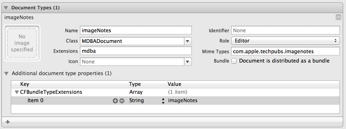 To declare a document type in Xcode, start by clicking the Add button in the target’s Info settings and choose Add Document Type from the pop-up menu. Click the triangle next to Untitled to disclose the property fields and add the properties in Table 2-1.
