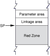 The linkage area is at the top of the stack frame, adjacent to the stack pointer. This positioning is necessary so the calling routine can find and restore the values stored there and also allow the called subroutine to find the caller’s parameter area. This placement means that a routine cannot push and pop parameters from the stack once the stack frame is set up.