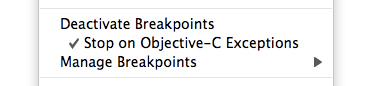 To add an Objective-C exception breakpoint, select Stop on Objective-C Exceptions under the Run > Activate/Deactivate menu, as shown in Figure 7-3.