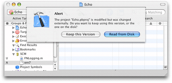 Click Discard My Changes to discard your modifications to the project file and use the latest version in the repository. If the dialog in Figure 22-17 appears, click Read From Disk to force Xcode to re-read the project file from disk (which is the latest version in the repository).