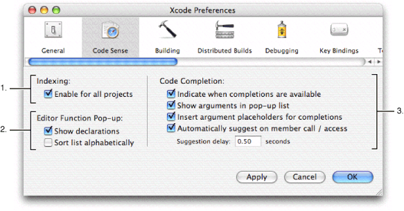 The Code Sense pane of the Xcode Preferences window contains options for controlling project indexing and Xcode’s interface for code completion. Figure 39-2 shows the Code Sense pane of Xcode Preferences.