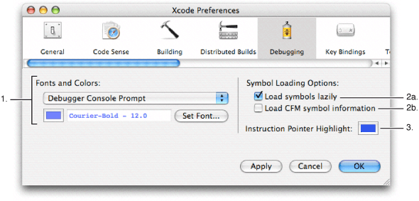 2. “Load CFM symbol infomration” specifies whether Xcode loads symbol information for CFM-based binaries.