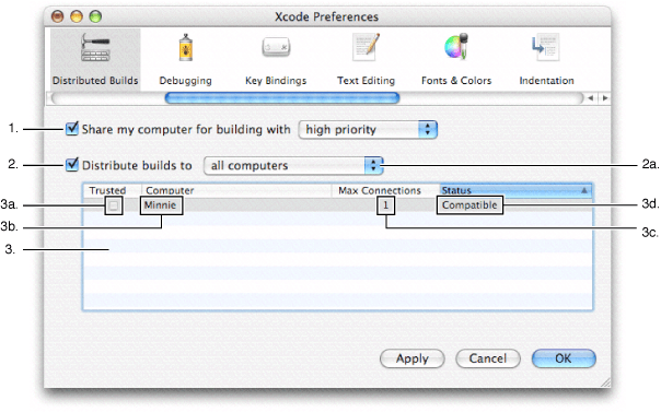 1. Whether the computer is trusted. You can restrict which computers Xcode distributes builds to, using the pop-up menu described in item 4. If you do so, you must indicate which of the available computers you “trust;” that is, which of the computers you allow Xcode to use for building. A computer is trusted if the checkbox in the Trusted column is selected.