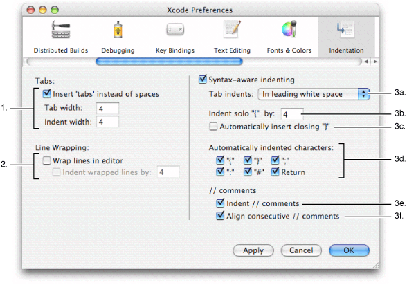 3. Syntax-aware indenting. This option, and the options below it, control automatic formatting options for source code in Xcode editors. If this option is selected, Xcode assists you in writing source code by automatically inserting formatting information appropriate for the current context. This option is disabled by default. See Indenting Code to learn more. The options are: