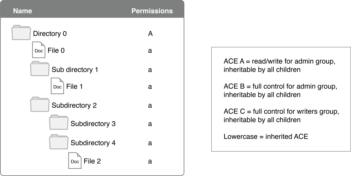 An ACL consists of an ordered list of ACEs (access control entries), each of which associates a user or group with a set of permissions and specifies whether each permission is allowed or denied. ACEs also include attributes related to inheritance (see Inheritance of Permissions).