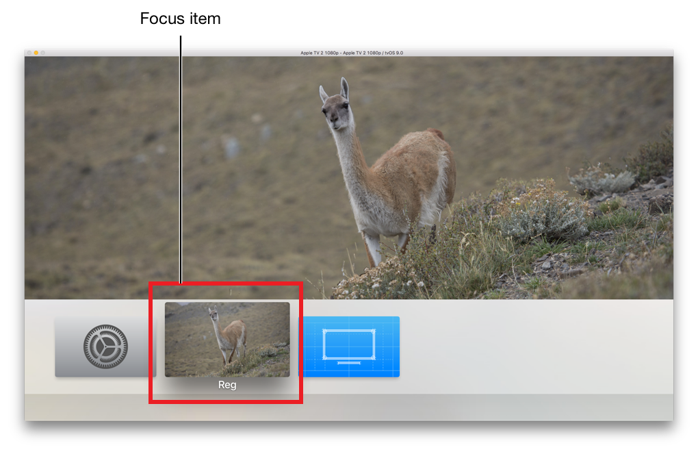 User interaction with the new Apple TV is based on a focus model. Users interact with the user interface indirectly using a remote. At any time, only one UI element is the target for any action taken on the remote. That UI element is said to be in focus. For example, in Figure 4-1 the button for the Reg app is in focus.