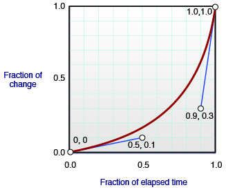 This example causes the animation to begin very slowly, completing only 10% of the change after 50% of the animation and 30% of the change after 90% of the animation. Since the function always ends at the point (1,1), the rest of the animation goes very quickly.