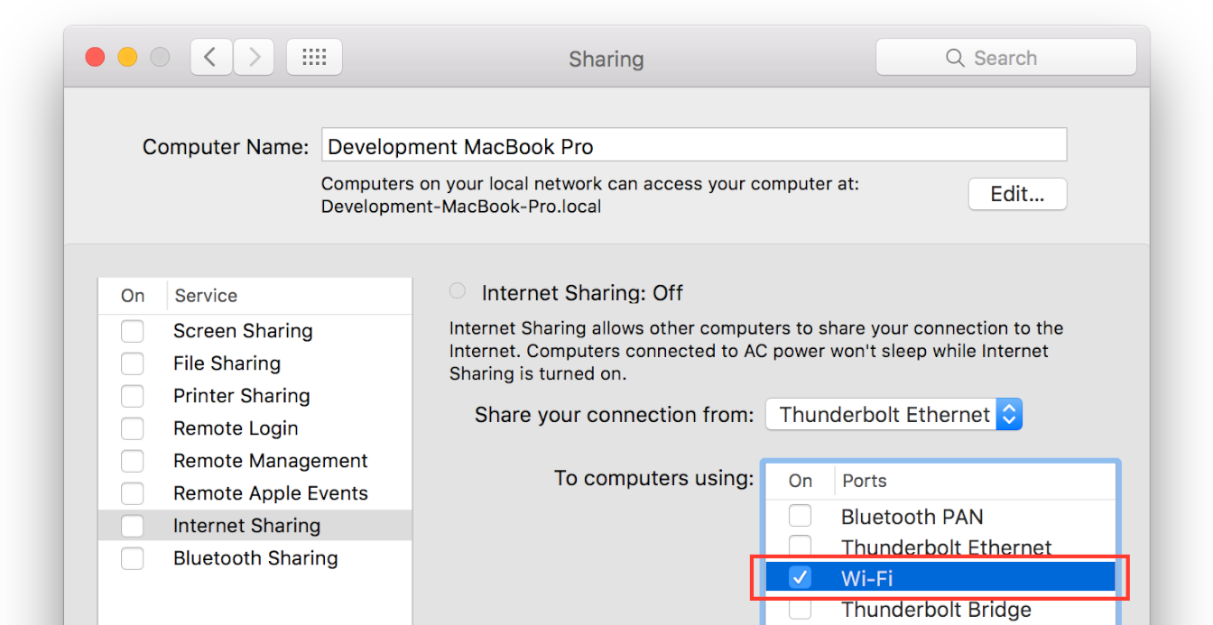 7. Choose the network interface that provides your Internet connection, such as Thunderbolt Ethernet.