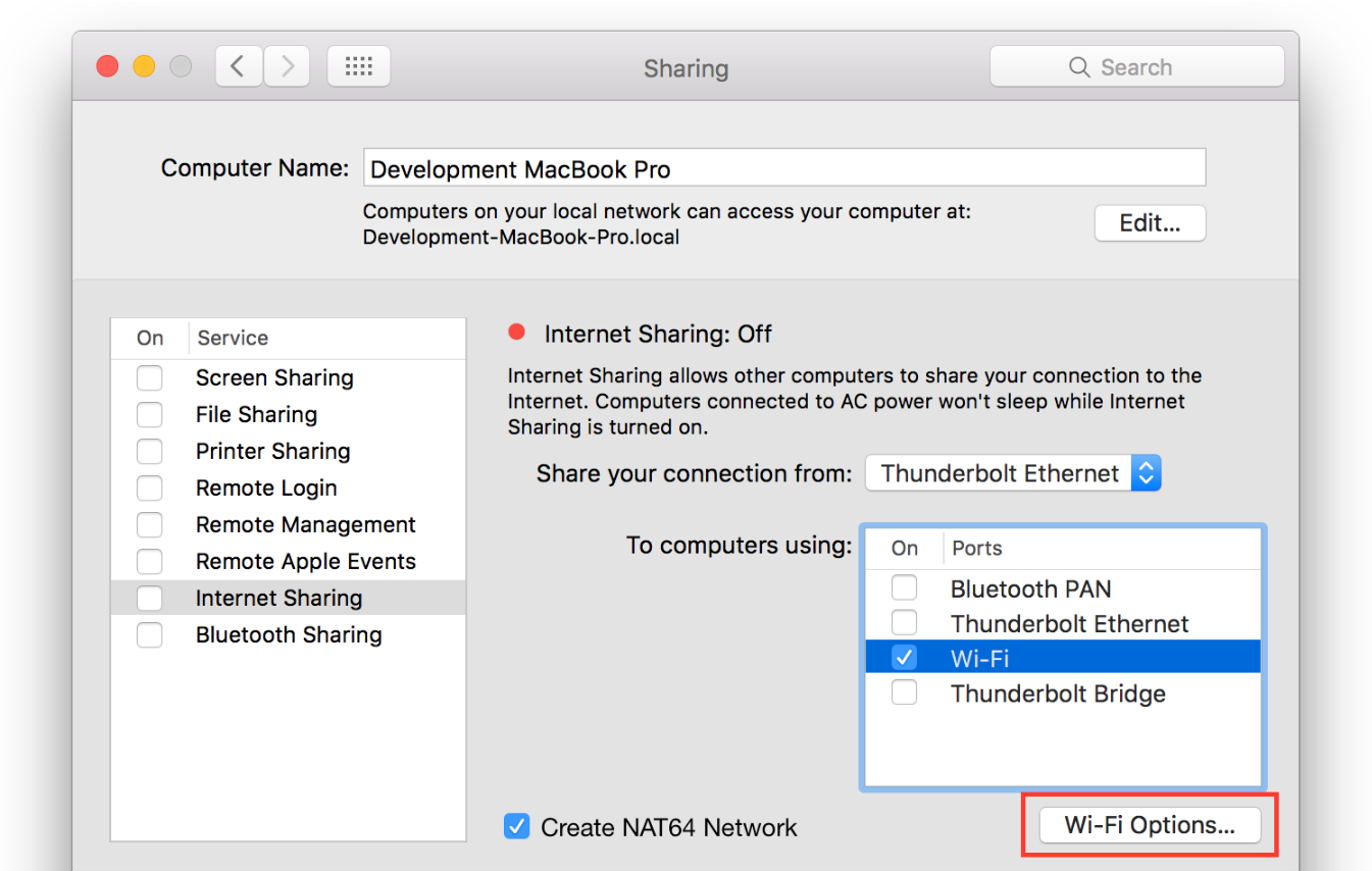 The easiest way to test your app for IPv6 DNS64/NAT64 compatibility—which is the type of network most cellular carriers are deploying—is to set up a local IPv6 DNS64/NAT64 network with your Mac. You can then connect to this network from your other devices for testing purposes. See Figure 10-6.