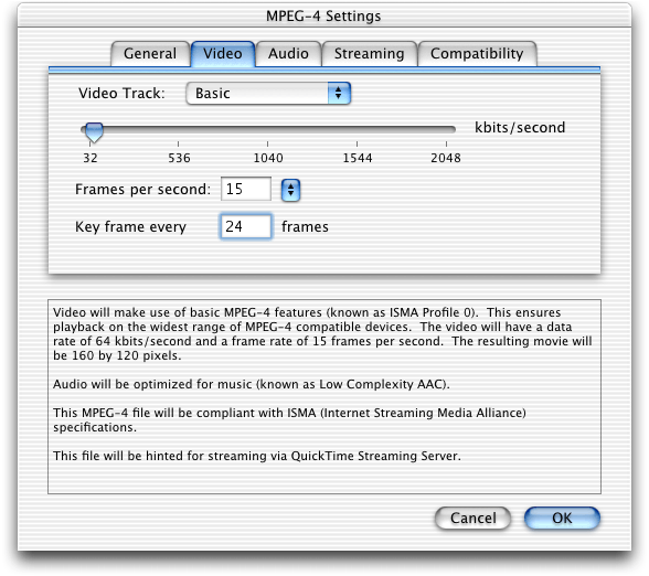 .mp4file or a QuickTime.movfile using MPEG-4 compression. This allows you to mix MPEG-4 audio and video with other QuickTime media, such as VR panoramas, sprites, or Flash tracks. Discussed in the section MPEG-4 and Web Developers.A new group of MPEG-4 settings dialogs in QuickTime Player that enable QuickTime Pro users who work with MP4 files to make a number of adjustments in video and audio tracks, streaming and compatibility. Discussed in the section Working with MPEG-4 Files.