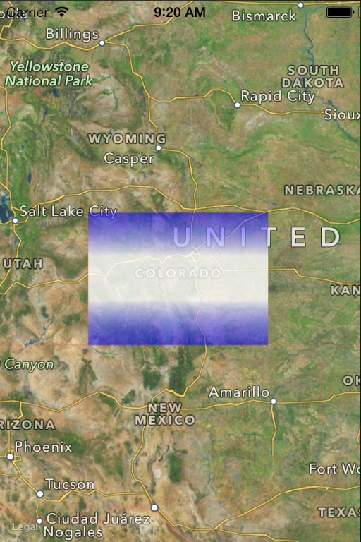 Figure 6-4 shows the results of drawing custom content over the overlay for the state of Colorado. In this case, the overlay renderer fills its content with a custom gradient.