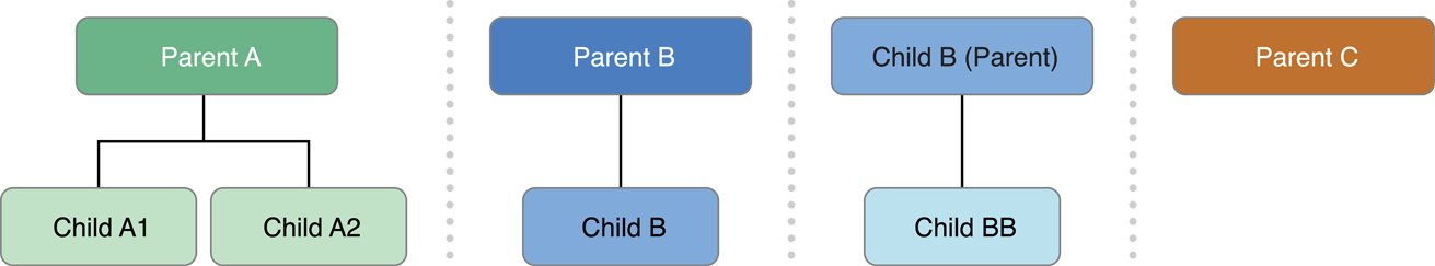 The example implementation of the prepareLayout method is split into two parts. Figure 6-2 shows the goal for the first half of the method. The code iterates over every cell, and if that cell has children, relates those children to the parent cell. As you can see in the figure, this process is done for every cell, including the children cells of other parent cells.