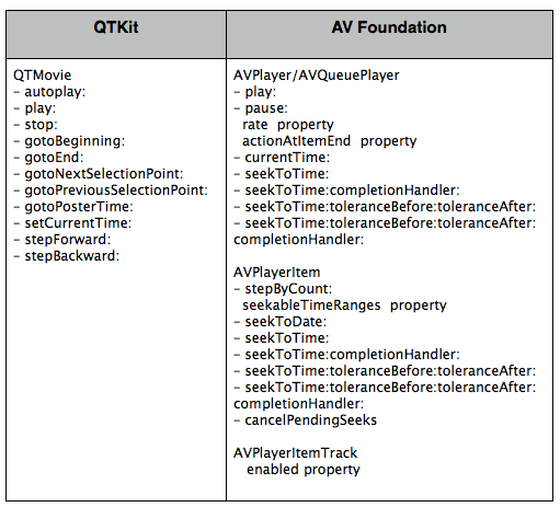 This document describes the mapping of the QTKit classes and methods to the newer AV Foundation classes to help you get started working with AV Foundation objects and their associated methods to accomplish a variety of tasks.