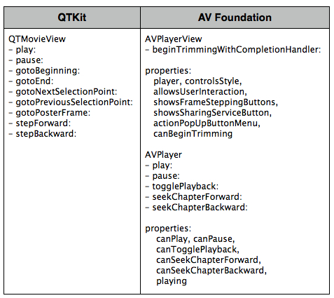 Here's a summary of the classes for representing audiovisual media with QTKit and AV Foundation: