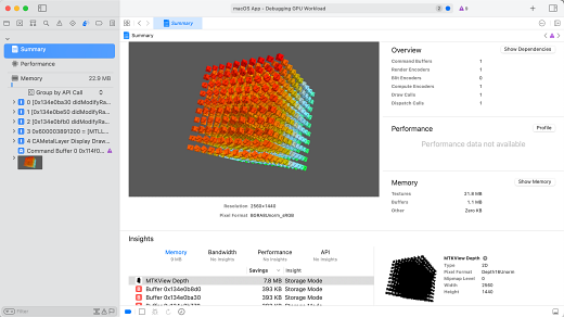 View sample codeInvoke Metal’s frame capture from your app, then save the resulting GPU trace to a file or view it in Xcode. This sample shows how to save a GPU trace to a file or view it in Xcode to explore the Metal commands produced by your app.