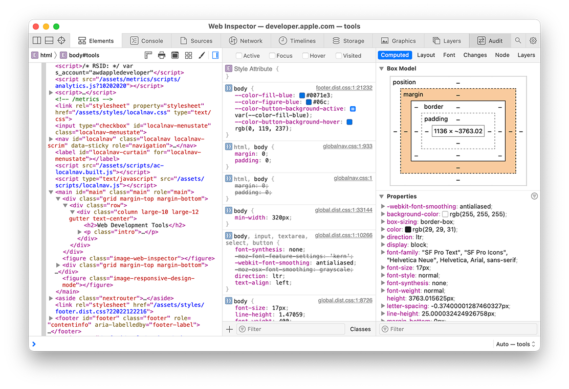 Elements. View and inspect the elements that make up the DOM of a web page. Clicking elements from the fully editable markup tree on the left reveals the node’s styles in the middle sidebar, with more details in the right sidebar.
